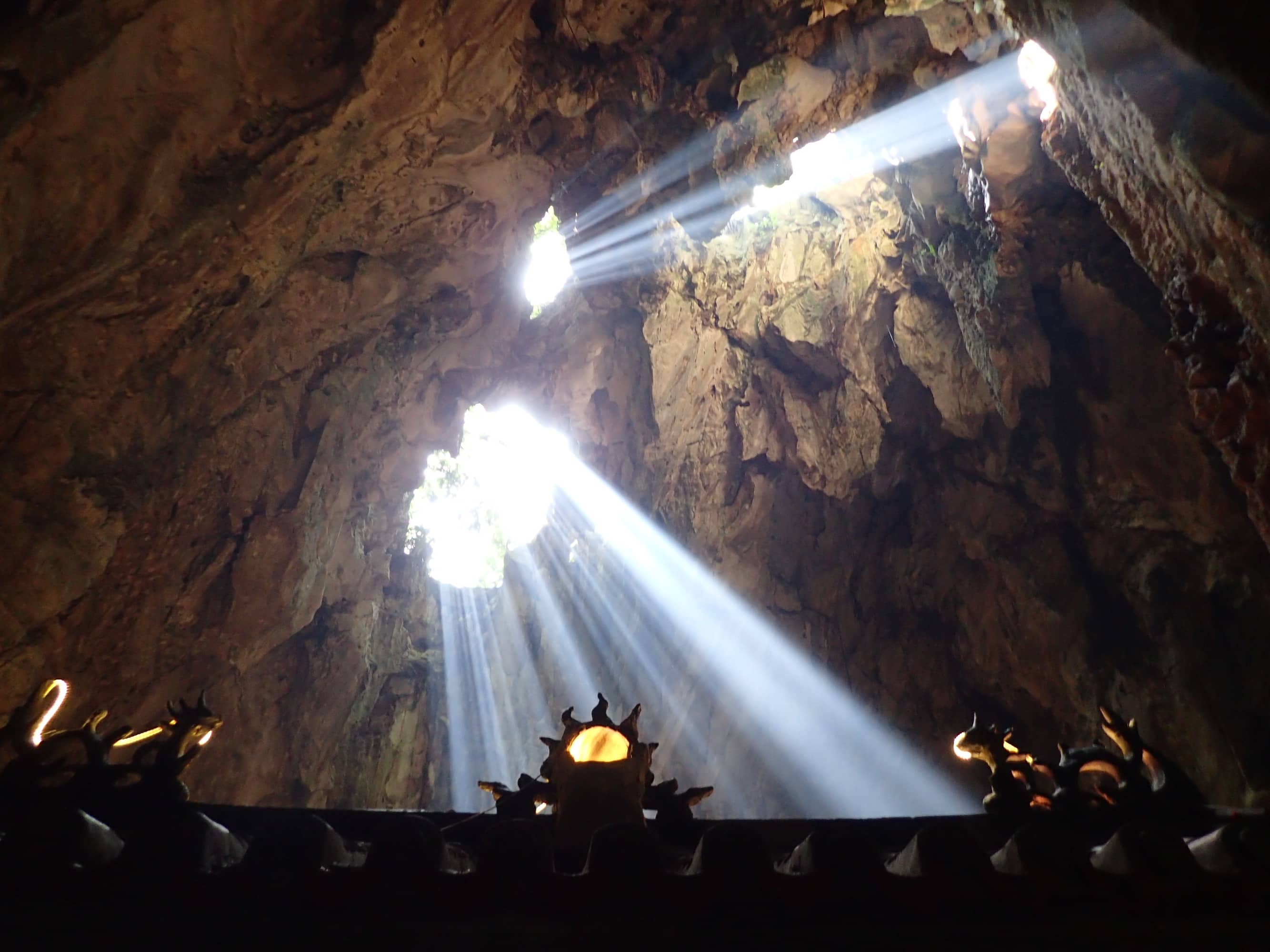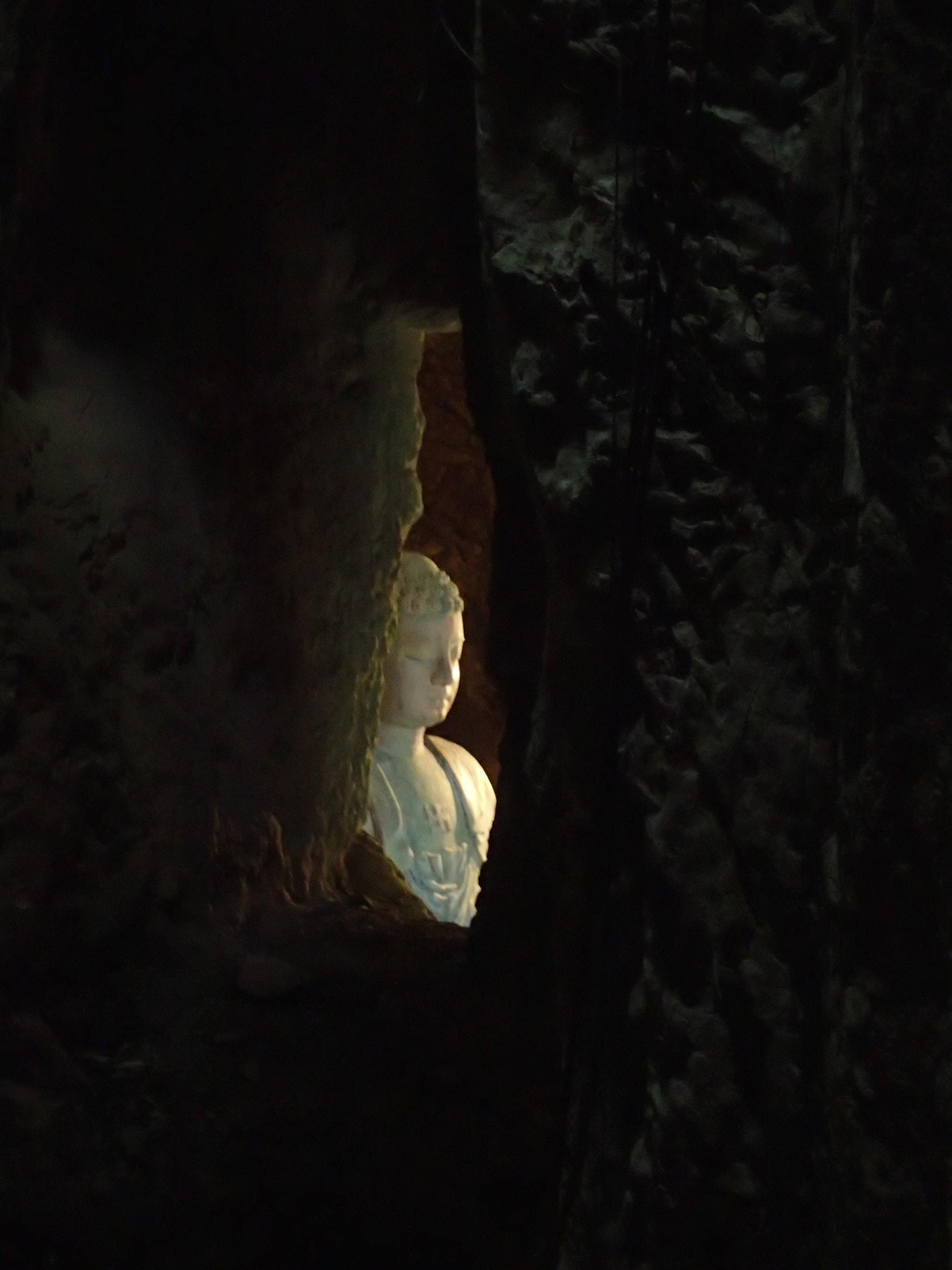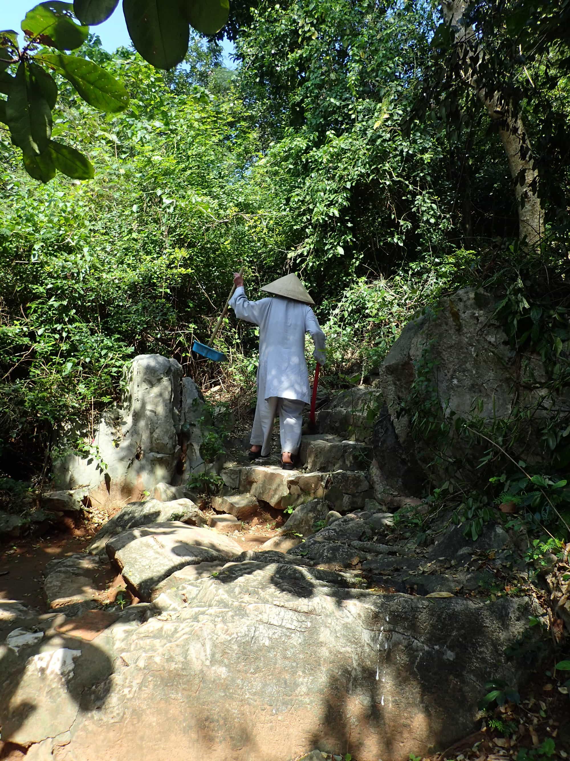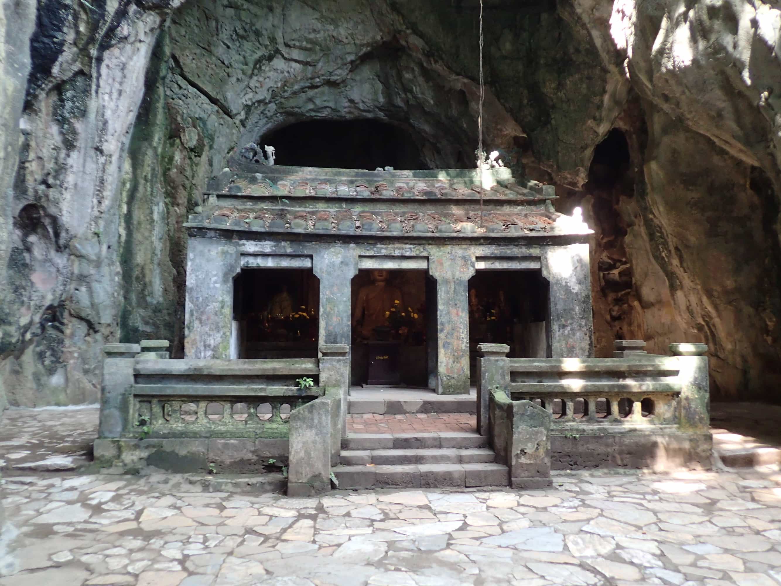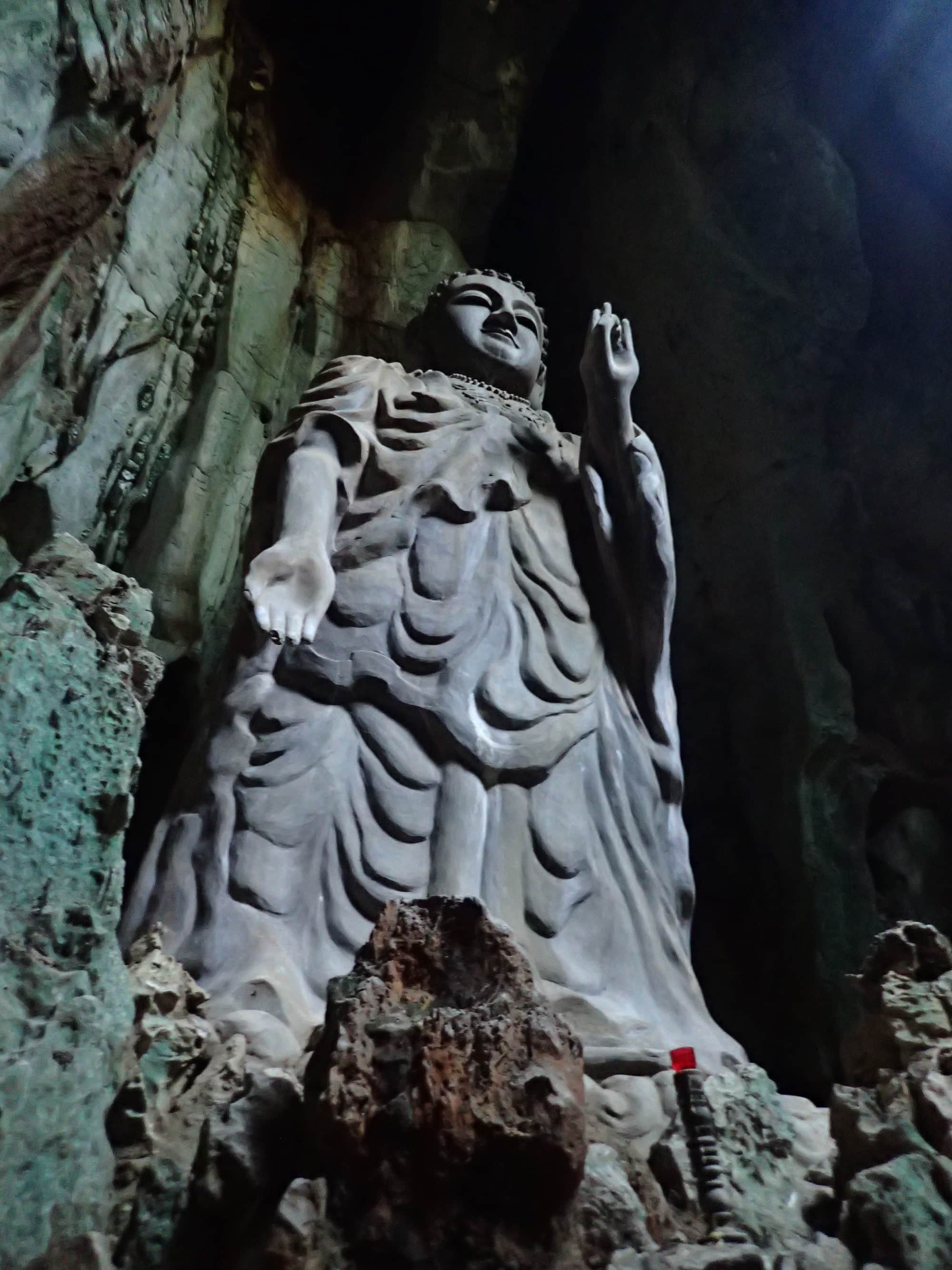 Für das Highlight Mamorberge hatten wir bedauerlicherweise nur eine Stunde Zeit. Zunächst mussten wir für die Besichtigung die vielen Treppen empor sprinten, dann eröffnete sich hinter einem Tempel die erste Höhle mit riesigen Budastatuen. Es gab noch vier weitere. Die größte war besonders eindrucksvoll, weil das Sonnenlicht und der Qualm von den Räucherstäbchen den kleinen Tempel in goldene Sonnenstrahlen einhüllte. Im Vietnamkrieg war dies ein Hospital der Vietcong gewesen. Vom Berg aus hatte man damals den Blick auf die China Beach. Dort verbrachten die Amerikaner während des Krieges ein paar Tage Urlaub.