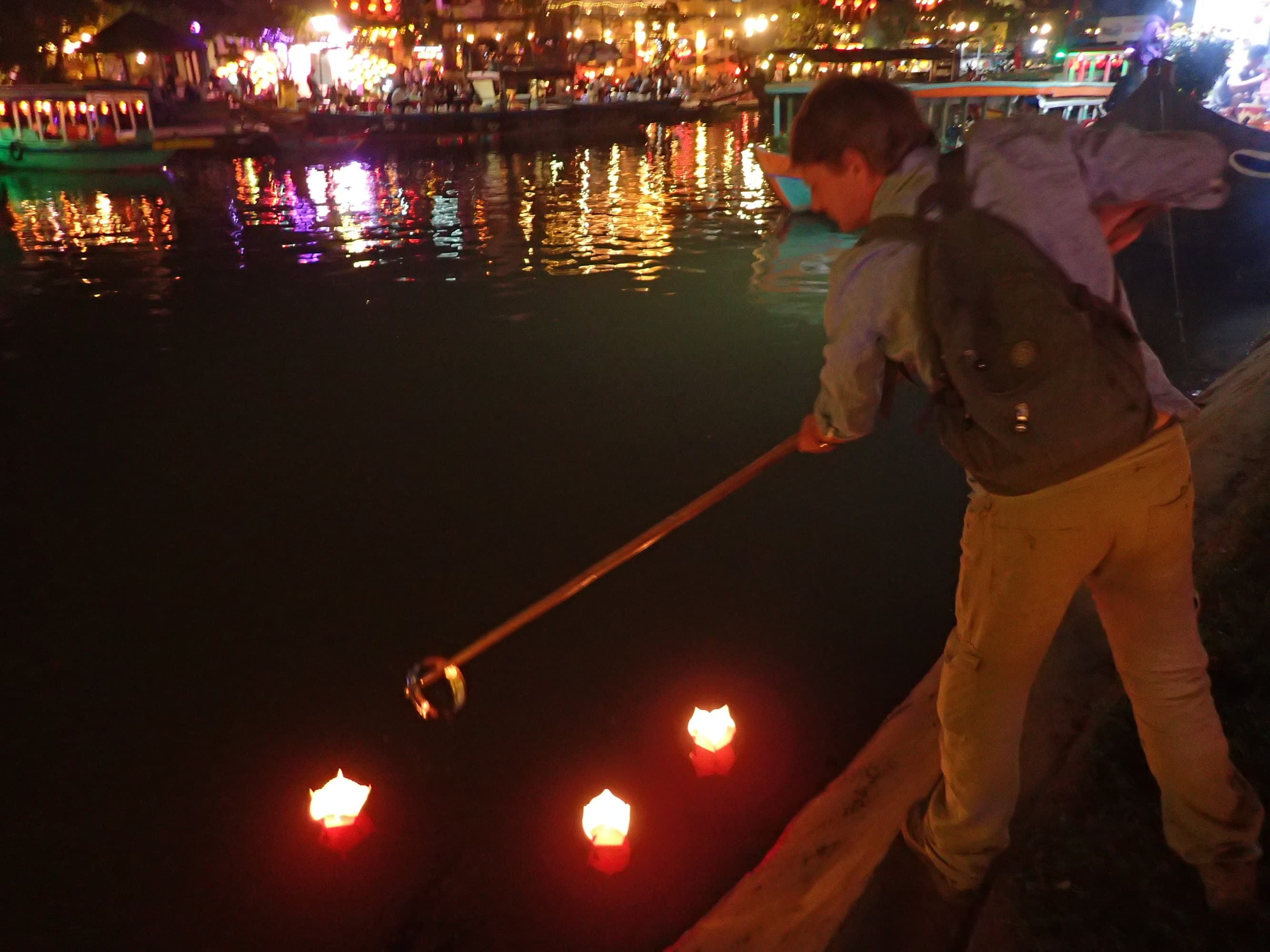 Heute ist in der Stadt ein großes Happening: TET ! Das Jahr des Huhnes beginnt und wird gebührend gefeiert. Wir machten uns schick und auf dem Drahtesel ging es dann in die Altstadt. Bezaubernde Laternen, Lichtershow, Bühnenprogramm und Jahrmarkt, der übrigens mit ganz einfachen selbst ausgedachten Spielen aufwartete. Und alle hatten sichtlich Spaß dabei. Auch Krissi versuchte blind einen Tonkrug zu zerscherbeln. Leider schlug sie einen halben Meter daneben. Nach einigen banana pancakes entschlossen wir uns, doch noch etwas Richtiges zu essen und landeten in einem Restaurant, das mit nur vier Angestellten bemüht war, so schnell wie möglich die Bestellung aufzunehmen, Essen zu kochen/bringen und abzukassieren. Nur das mit dem Glas zum Bier und die extra Käseportion brachte sie etwas aus dem Zeitkonzept… Das Bier war dann schon fast leer als das Glas kam und die Spaghetti zu kalt für den Käse. Inzwischen hatte sich auch schon ein Mr. Lie zu uns gesellt und wollte uns eine Tour anbieten, die wir dankend ablehnten.
