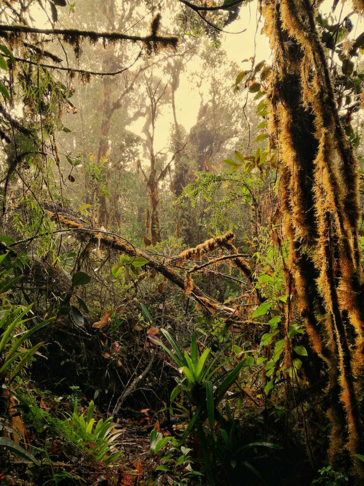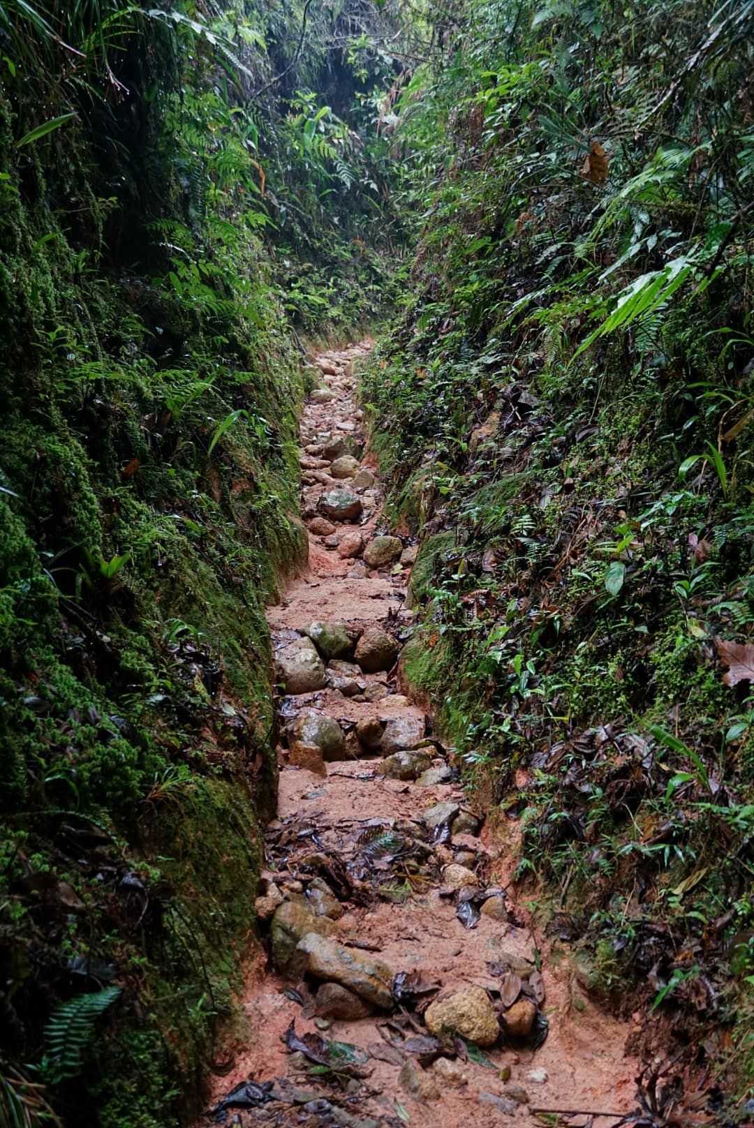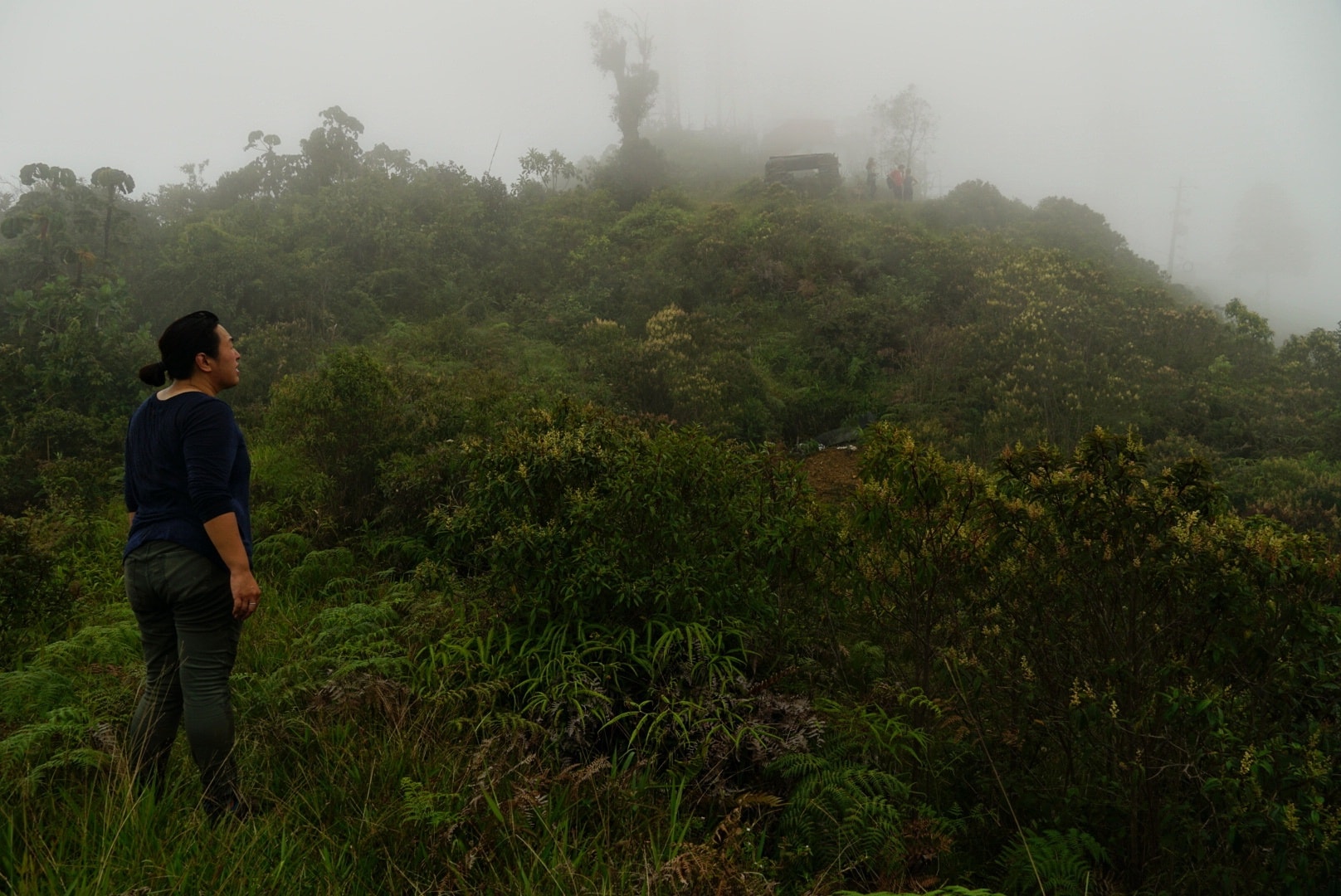 Allerdings fand ich die Tour in die Berge spektakulärer. Vielleicht weil es auf noch schmaleren Pfaden bergauf ging oder weil in Gipfelnähe ständig Wolken sind und somit eine Luftfeuchtigkeit herrschte, wie man sie sich eben im Dschungel vorstellt. Genauso war auch die Vegetation. Wir krochen gebückt unter Wurzeln hindurch, um in der nächsten Kurve wieder im Blätterwald zu verschwinden. Dieser Pfad wurde im 18. Jahrhundert bereits vom Militär genutzt und später von der Guerilla. Ich fühlte mich ein bisschen wie im Film. Da der eigentliche Rückweg zugewachsen war, folgten wir einem anderen Weg, der auf dem Kamm der Berge entlang führte. Bis plötzlich aus dem Nebel ein Soldat auftauchte. Was wir hier wollen? Ja eigentlich raus aus dem Dschungel, zurück ins Quartier. Okay, aber keine Fotos machen. Wir waren an der Militärstation angekommen, die wir von unserer Farm in lichten Momenten erspähen konnten. Wir durften das Gelände passieren und mussten uns nun aber sputen – in einer dreiviertel Stunde wird das Licht ausgeknipst und wir mussten noch einen steilen matschigen Bergpfad hinab.