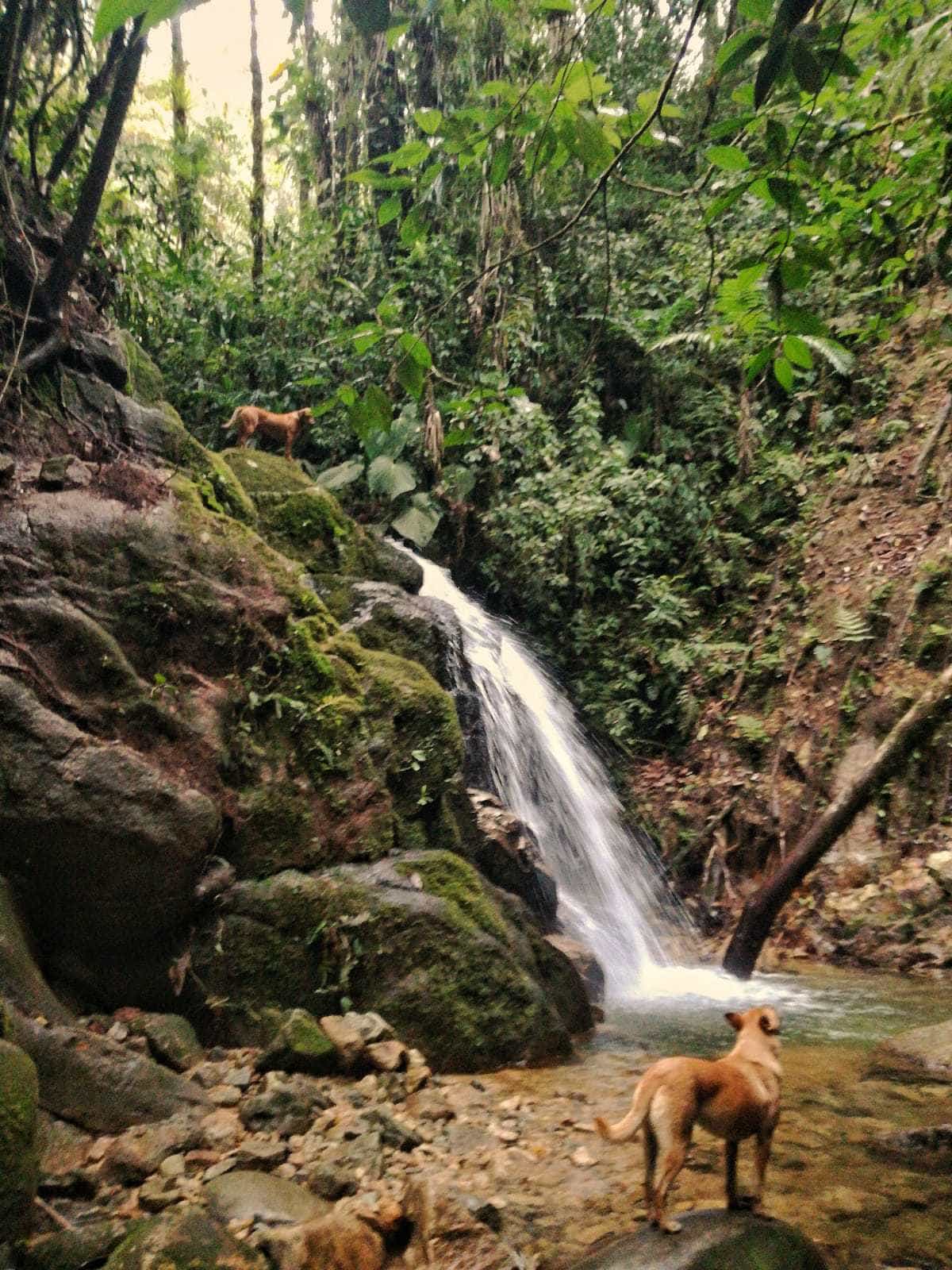 Die bekannteste Tour führt zu einem Wasserfall. Man könne es nicht verfehlen, hieß es. Kann man wohl, wie sich herausstellte. Wenn man dem falschen Flusslauf folgt, sich durch, unter und an Spinnennestern vorbei schleicht, mehr im Fluss entlang wandert als auf irgendwelchen Pfaden und nicht stutzig wird, dass es der falsche Weg sein muss. Auf dem Rückweg zeigten uns dann Alma und Toni (zwei Hunde), wo es eigentlich lang ging. Und es hat sich gelohnt, nasse Schuhe inklusive.